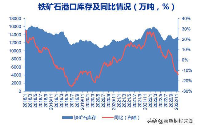 2018-2022年鐵礦石港口庫存及同比情況(單位:萬噸)
